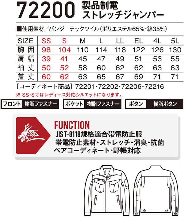 スペック メーカー 自重堂(JICHODO) 品番/シリーズ 72200 72201/Z-GRAGON 72200シリーズ シーズン 秋冬物 ※このシリーズの春夏対応シリーズはコチラ 商品名 製品制電ストレッチジャンパー&製品制電ストレッチノータックパンツセット(上下同色) 素材 バンジーテックツイル(ポリエステル65%・綿35%) 仕様 JIS T-8118規格適合、帯電防止服、帯電防止素材、ストレッチ、消臭・抗菌、ペアコーディネート、野帳対応(ジャンパーのみ) ※ SS・S寸はレディース対応シルエットになります。