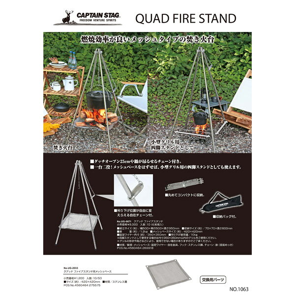 CAPTAIN STAG(キャプテンスタッグ)の一覧はこちら幅500×奥行500×高さ950mm重量1200g材質:脚部・メッシュベース・固定ワイヤー・自在金具、フック:ステンレス鋼、チェーン:鉄(亜鉛めっき)収納バッグ付、収納サイズ(約)/70×70×長さ600mm、メッシュベースサイズ(約)/420×420mm、固定ワイヤー内寸(約)/350×350mm、吊り下げ耐荷重/10kgメッシュベース:「UG-2033」※四脚スタンドとして使用する場合、内寸350×350mm以内のグリルが使用可能※グリルの形状や高さなどにより、使用できない場合があります。